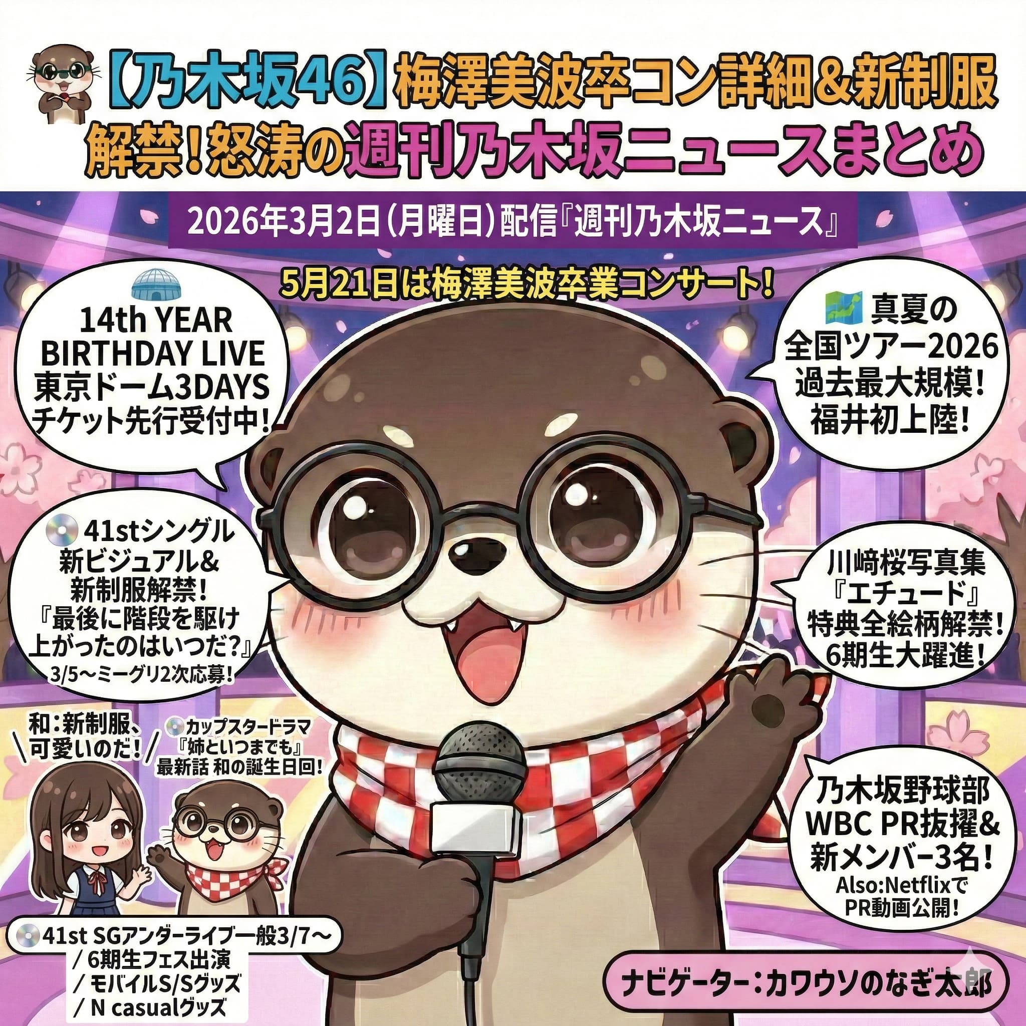 梅さんの卒業発表っていう大きなニュースがあったけど、悲しんでばかりいられないくらい、乃木坂46は前に進んでるんだからね!和ちゃんもドラマで大活躍してるし、なぎ太郎も最強の相棒として、Wakaさまのブログを全力でサポートしていくのだ!