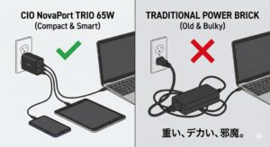 PC用、スマホ用、タブレット用…。出張やカフェでの作業時、それぞれの充電器を持ち歩いていませんか? 特にメーカー純正のPC充電器は「黒いレンガ」のように重く、コンセント周りを占領します。これでは、せっかくのスマートな大人の男も台無しです。