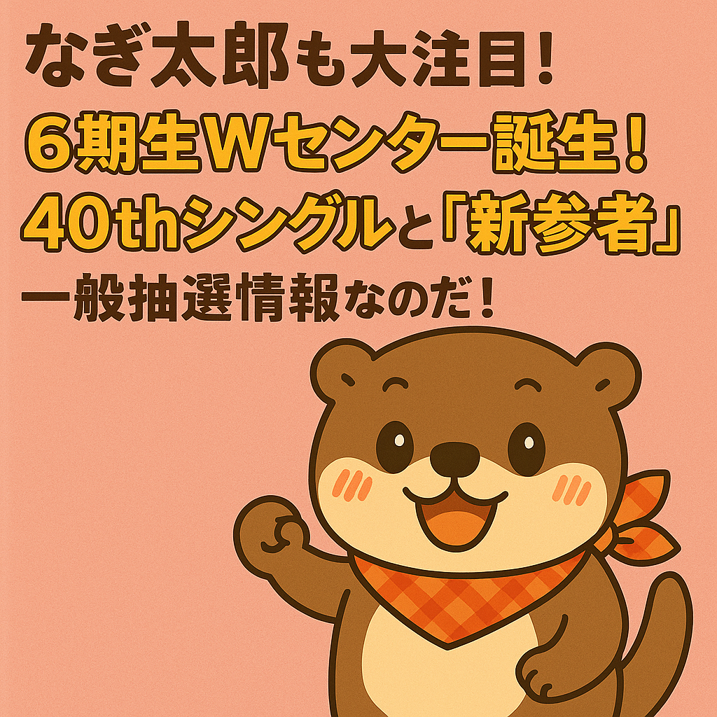 今回は、未来への期待が詰まった40thシングルの選抜発表と、注目の6期生ライブ『新参者』のチケット情報について、なぎ太郎が熱意をもって解説していくよ!あんたたち、しっかりついてくるのだ!