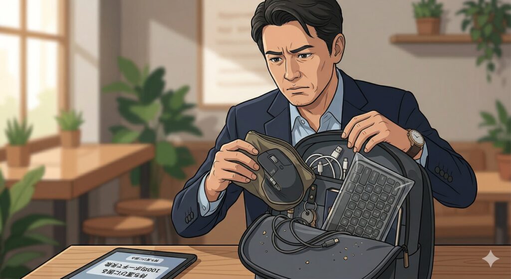 そのままカバンに裸で放り込むのは、例えるなら砂利道に高級車を無防備で乗り入れるようなものです。カバンの中で他の荷物とぶつかり、美しいボディに傷がつき、最悪の場合はキーボードの隙間にゴミが入り込んだり、マウスの精密なホイールが歪んだりしてしまいます。