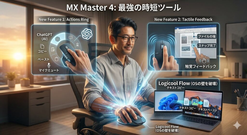 ここからは、MX Master 4がなぜ40代のプロフェッショナルたちから「最強の時短ツール」として圧倒的な支持を集めているのか、その具体的な最新機能(ベネフィット)を解説します。