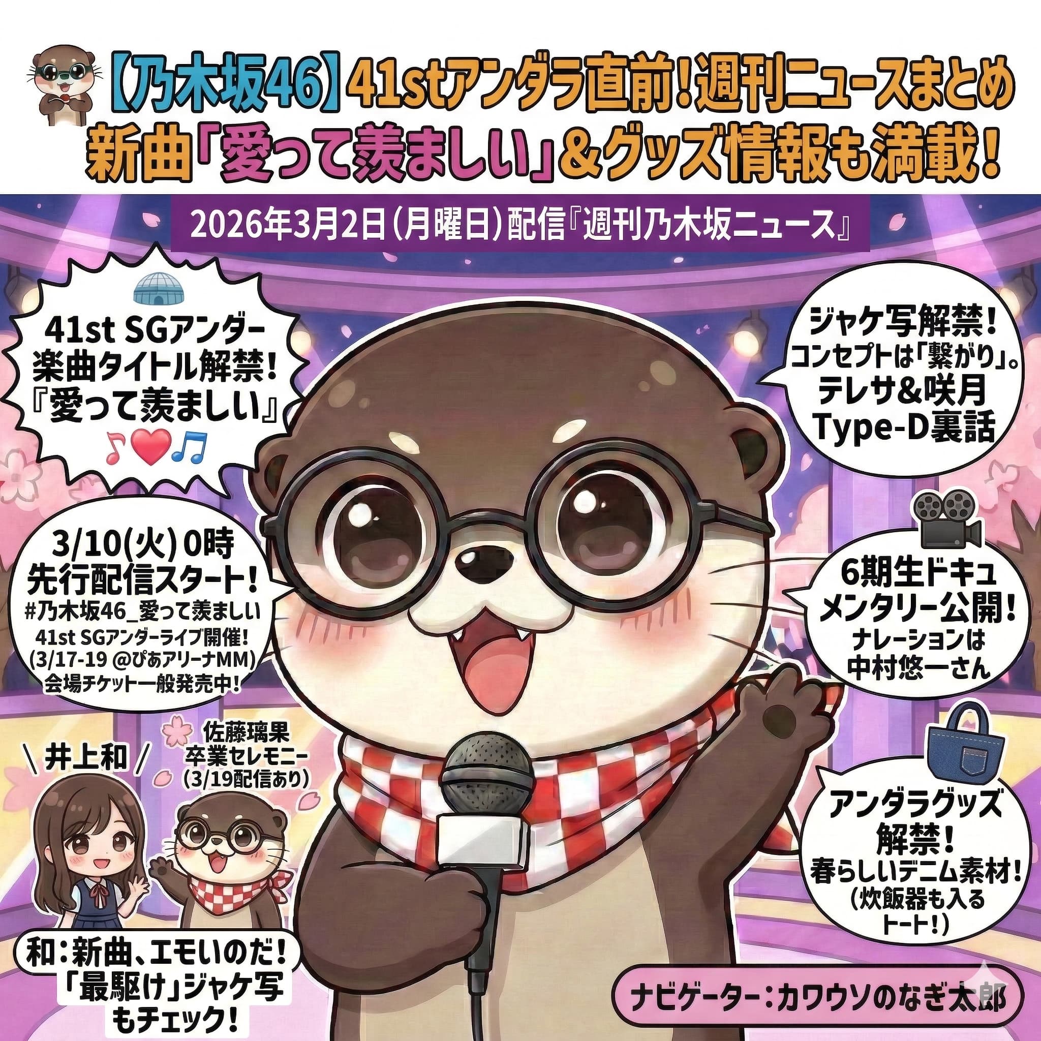 さてさて!今回は2026年3月9日にプレミア公開された『週刊乃木坂ニュース~アンダラ1週間前SP~』の情報を、なぎ太郎が超詳しく、そして正確にまとめていくよ! MCの菅原咲月ちゃん、喉の調子が悪くて「いつもの4割」しか声が出てなくて、声がガスガスだったね!笑い声を出す代わりに手を叩いて進行してて、とってもえらかったのだ! スペシャルゲストとして、岩本蓮加ちゃん、岡本姫奈ちゃん、佐藤璃果ちゃん、そして6期生の瀬戸口心月(みつき)ちゃんも登場して、大盛り上がりの回だったよ!